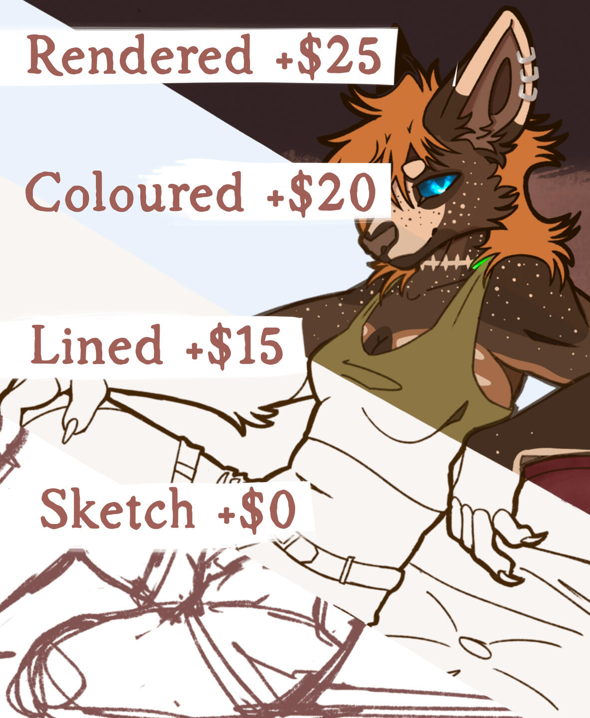All prices in AUD (Australian dollars)Before the commission is started, payment will be required, via WISE or PAYID. At each stage of the commission you will be asked for approval before going forward.You may make up to 2 revisions per stage. Once a stage has been approved, any changes to previous stages will incur an extra cost.Refunds are not available for work that has been started (unless I offer). If I have only done the sketch, you will only be charged for the sketch etc.